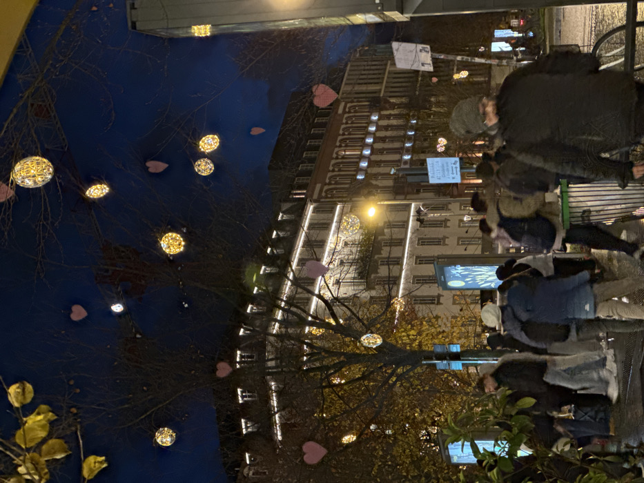 A nighttime urban scene shows pedestrians on a sidewalk adjacent to a tall building. Trees are adorned with spherical lights and pink heart-shaped decorations. Streetlights and displays illuminate the area. People are walking along the street, some facing the camera and some with their backs turned. The sky is dark blue, and the general atmosphere suggests a festive or holiday setting.