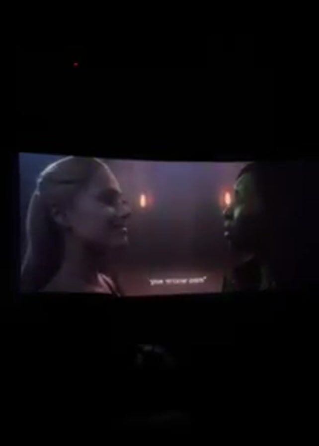 darkened movie theater screen displaying a scene with two women. One woman on the left has pale skin and light blonde hair pulled back. The other woman on the right has dark skin and dark hair. Both women are facing each other and appear to be engaged in a conversation, as indicated by subtitles in Hebrew at the bottom of the screen. The background is dark with dim lighting suggesting an indoor setting. The video is dark and appears to be taken with a phone in a dimly lit theater, with the screen being the primary source of light.