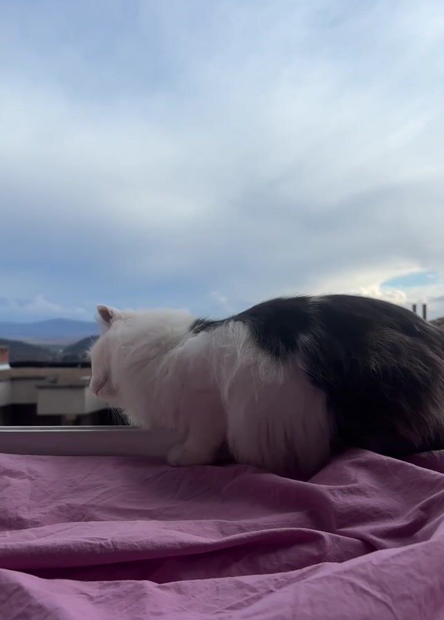 white and grey cat lying on a pink sheet in front of a window. The cat is facing away from the camera, looking out the window at a cloudy sky and distant buildings and mountains. The cat is still and quiet, simply observing the outside world. The scene is peaceful and serene.