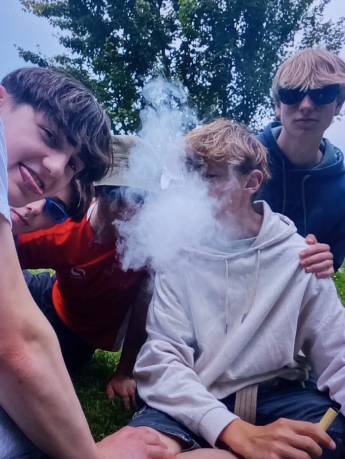 The image displays five young males outdoors in Miękinia, Poland. Four individuals are prominently featured, with a fifth partially visible. In the foreground, a male with dark hair wears a light-colored shirt and looks towards the camera with his tongue extended; a superficial abrasion is present on his left elbow. Directly behind him, another male is partially visible, wearing blue sunglasses and a red t-shirt. Central to the frame, a male with light-colored hair, dressed in a light beige hooded sweatshirt and dark shorts, is actively exhaling a dense plume of vapor from a yellow-tipped vaping device held in his right hand. His left arm rests on the shoulder of the foreground male. To the right, a male with light hair and dark sunglasses, wearing a dark blue hooded sweatshirt, looks directly at the camera with a neutral expression; his right hand rests on the shoulder of the male in the beige hoodie. A fifth individual's arm is partially visible on the far left. The group is situated on green grass, beneath a canopy of green trees visible against a light sky, indicative of natural daylight conditions.
