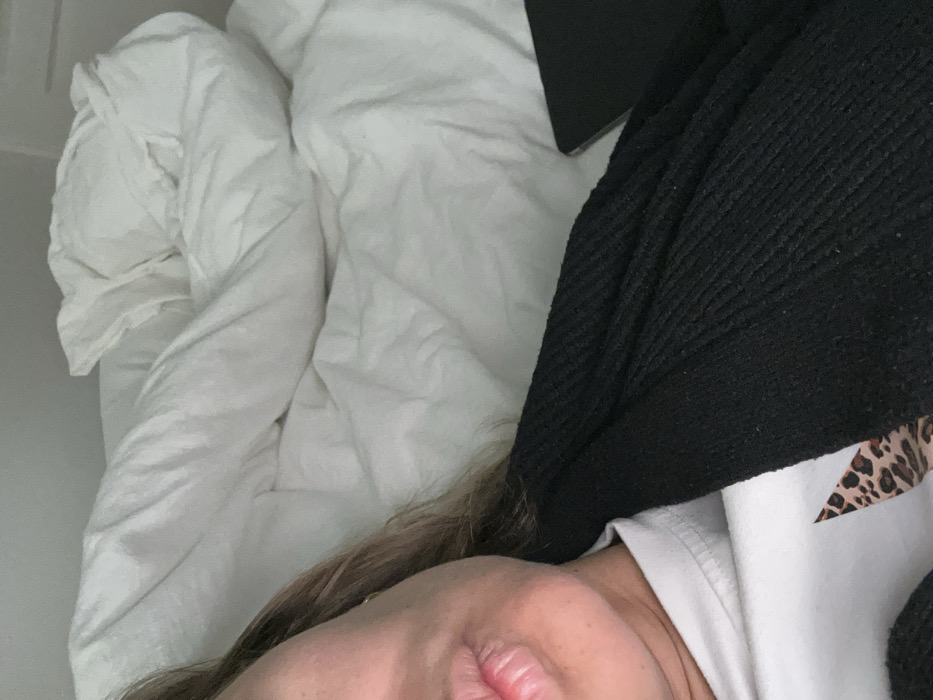 A close-up captures a person lying in bed amidst crumpled white sheets and pillows. A black, textured sweater or blanket covers part of their body. A glimpse of a white shirt with a leopard-print design is visible beneath the sweater. The person's face, including their lips and a hint of their hair, is partially in the frame. The overall composition suggests a relaxed, possibly lazy, moment in bed.