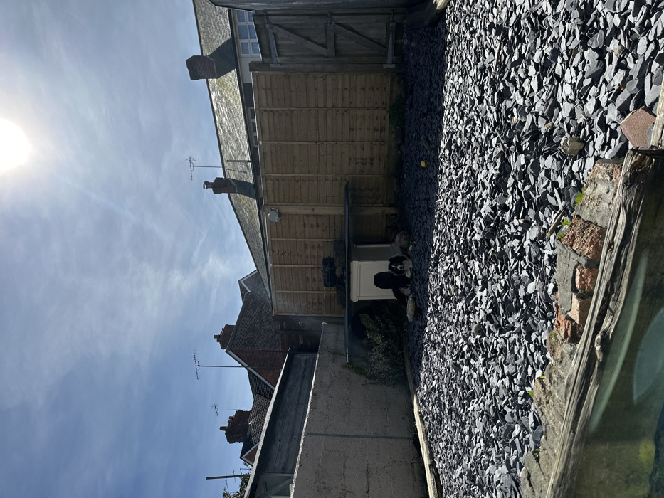 The image depicts a residential backyard in Dorchester, United Kingdom, under a bright, clear sky. The foreground features a weathered wooden beam positioned over exposed red brickwork. The ground throughout the visible garden area is covered in dark grey slate chippings. In the mid-ground, a white dog kennel with a dark flat roof is situated towards the left. Two dogs are resting adjacent to the kennel: a black and white dog, resembling a Border Collie, lies partially within the kennel's entrance, while a smaller, lighter-colored dog rests beside it on the slate. A small yellow ball is visible on the slate chippings to the right of the kennel area. The perimeter of the garden is defined by a tall, light brown wooden fence constructed from vertical planks at the back, extending to a wooden gate on the far right. To the left, a grey concrete block wall forms another boundary. Beyond these boundaries, several residential rooftops with dark tiles, red brick chimneys, and television aerials are visible. The sky above is light blue with scattered faint cirrus clouds, and a bright sun, positioned in the upper right quadrant, casts strong shadows, indicating daytime.