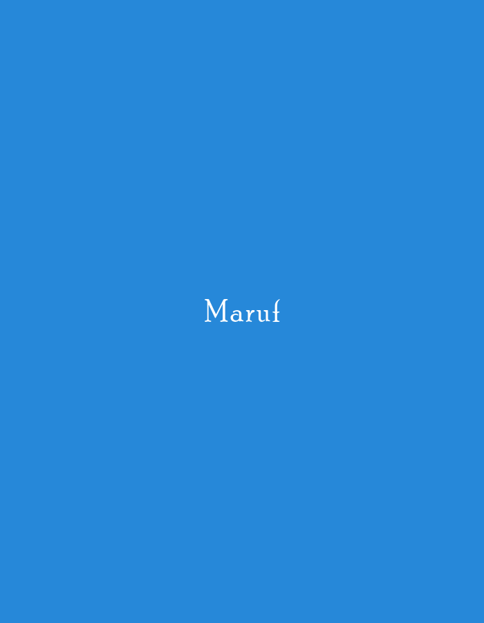 The image displays a uniform, solid blue background. Centered horizontally and vertically on this field is the word "Maruf," rendered in white, serif typography. No other visual elements, such as people, subjects, objects, actions, interactions, or environmental details, are present. The visual content of this image does not depict a specific physical location within the city of Jizzakh, Uzbekistan, or any other geographic area.