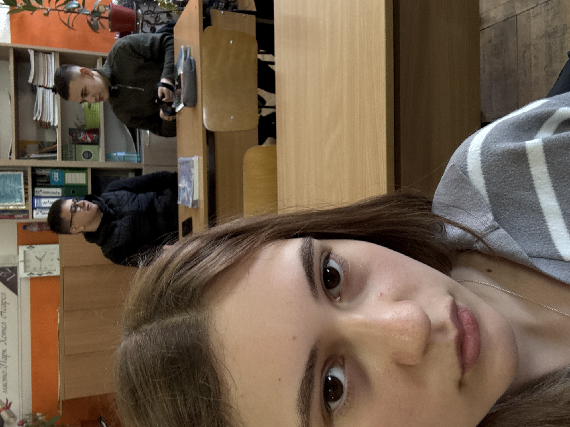 A selfie is taken indoors. A young woman with brown hair and light skin is in the foreground, wearing a grey and white striped top. Her face is close to the camera, showing her eyes, nose, and lips. Behind her, two young men are visible. One is wearing a dark green jacket, and the other is wearing a black jacket and glasses. They appear to be seated at desks in a classroom-like setting. The room contains wooden desks, chairs, and a bookshelf with various items, including books and plants. A clock is visible on the wall. The location is Panagyurishte, Bulgaria.
