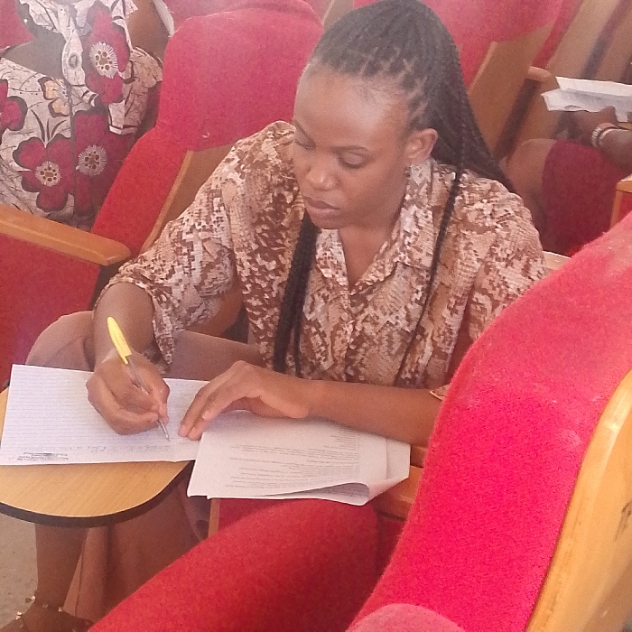 An indoor scene depicts an adult female with dark skin and dark braided hair, styled back, seated in what appears to be a lecture hall or conference room. She is positioned in a red upholstered seat equipped with a light-colored wooden writing tablet. The female is wearing a brown and beige patterned collared shirt and brown trousers. Her right hand holds a yellow ballpoint pen, actively writing on a white, lined sheet of paper placed on the tablet. Her left hand rests on a stack of white papers to the right of her writing surface. Behind her, to the left, another individual is partially visible, wearing a dark garment with a red and white floral pattern, seated in a similar red chair. The arm and side of an additional red upholstered seat are visible in the immediate foreground to the right, adjacent to the subject's leg, which is clad in red trousers. The overall environment suggests a formal instructional or meeting setting. Specific location within the city of Unknown, Unknown is not identifiable from the image.