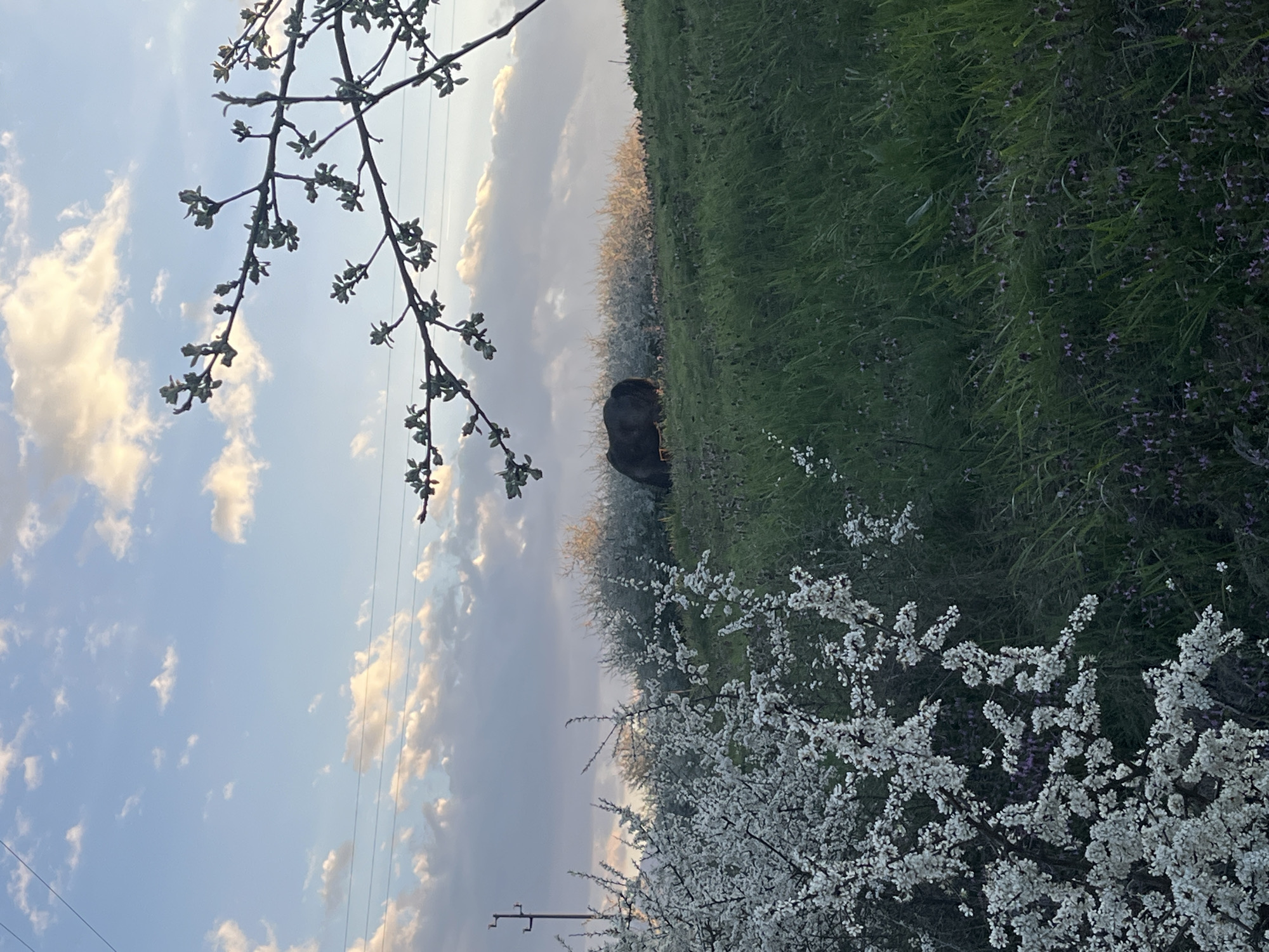 rural scene in Pudria, Bulgaria. The sky is partly cloudy with a blue hue. In the foreground, there's a tree branch with young leaves on the left and a cluster of white flowering bushes on the bottom right. A dark animal, possibly a dog or a goat, stands in the middle ground amidst a field of green grass and purple wildflowers. The background is a blurred line of trees or bushes. Utility poles with power lines are visible against the sky.