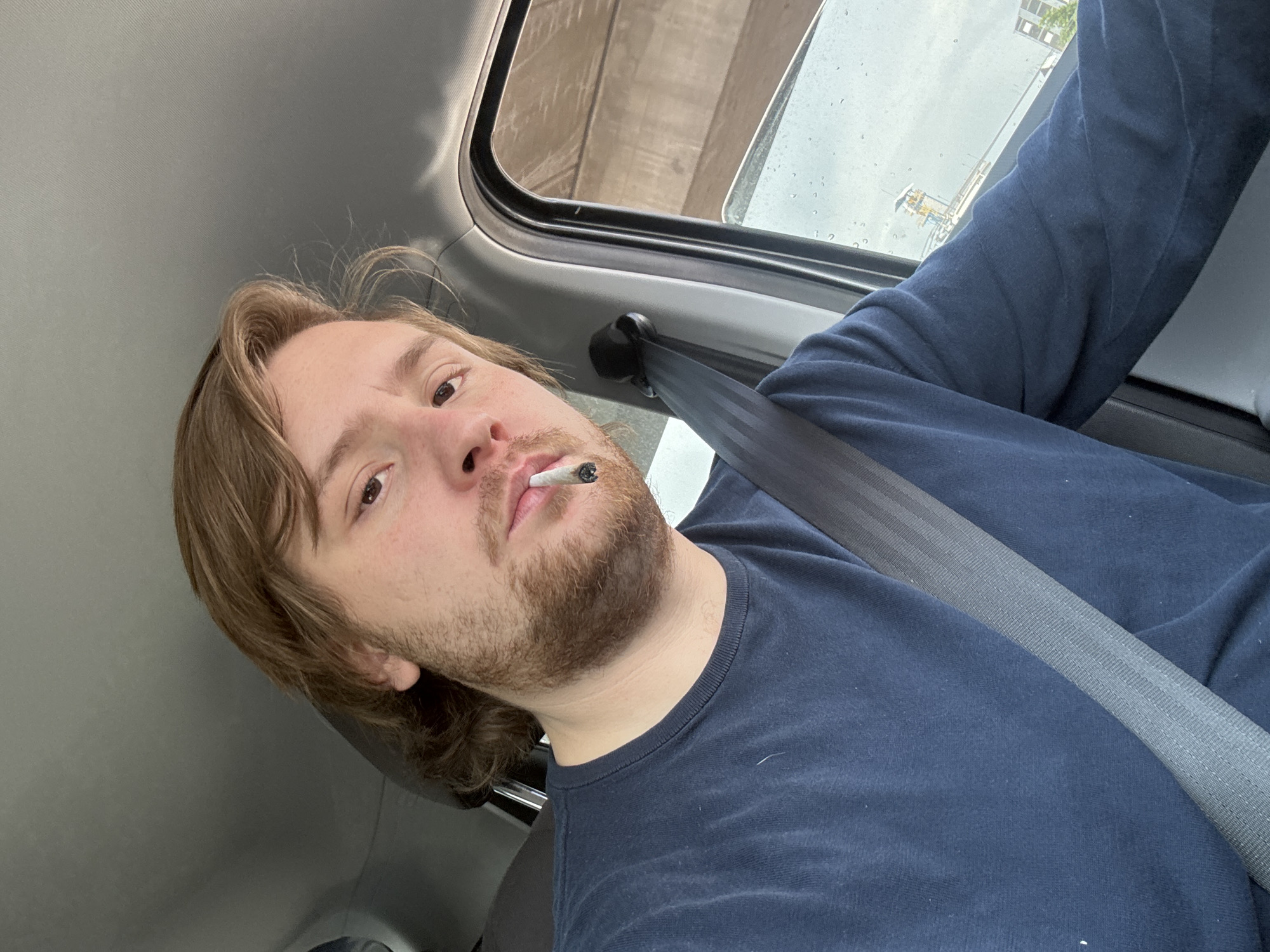 A close-up selfie shows a man with light brown hair and a beard, wearing a navy blue long-sleeved shirt and a seatbelt