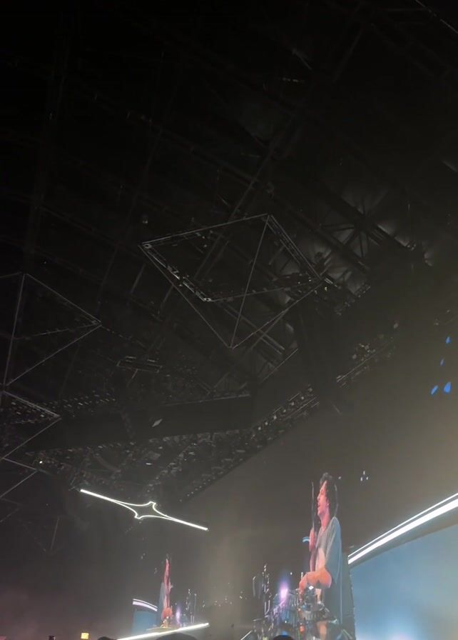 concert from the perspective of a person in the crowd. The ceiling is dark and has complex metal structures. Onstage, two people are performing under bright lights and smoke. Their images are also displayed on large screens behind them. The crowd appears dense, with many people's heads visible.