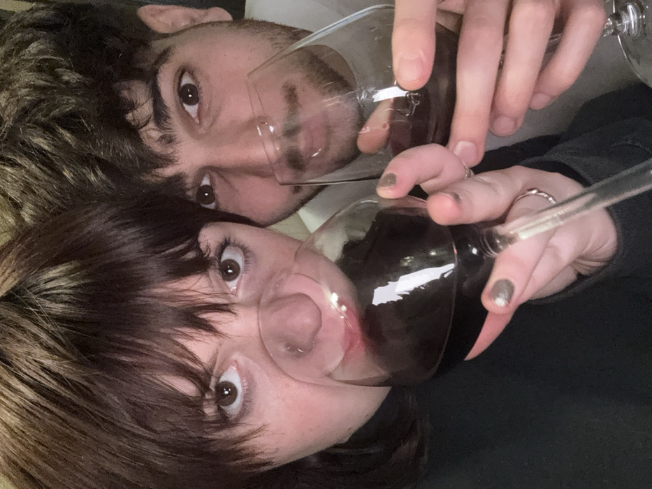 - "A couple is positioned closely together, faces near each other, holding large wine glasses filled with red wine" by FM-IdNfF2, licensed under CC BY 4.0