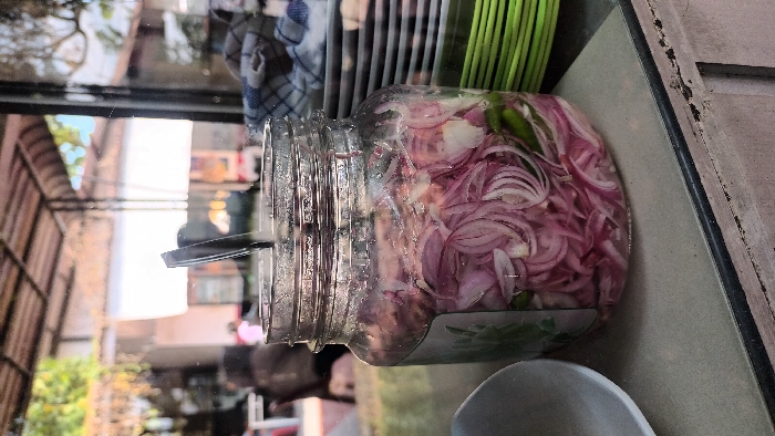 - "A glass jar filled with thinly sliced red onions and green chilies sits on a gray surface" by FM-O6sHh1, licensed under CC BY 4.0