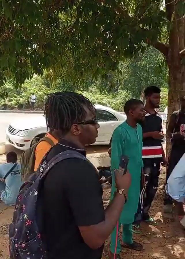 Here is a forensic description of the video: **Scene:** The video appears to be taken outdoors, likely in a public space, with a dirt ground and trees overhead. **People:** There are several individuals present, mostly men, dressed in casual clothing. Their attire varies, including t-shirts, traditional African garments (green robe), basketball jerseys (Bulls), and tracksuits. Some wear hats, sunglasses, and backpacks. Several of them appear to be using mobile phones. **Objects:** The scene includes a few parked cars on the roadside and a parked motorcycle. **Actions and Interactions:** The people are standing or sitting around a tree. Some of them appear to be interacting with each other in a casual manner, possibly in conversation. A man is sitting on the motorcycle. One man is holding his phone and wearing a backpack, and a red string. **Environment:** The environment is a mix of natural and urban elements with a road in the background. The presence of trees suggests a park or public area. **Overall:** The video depicts a group of men casually gathering outdoors, possibly socializing or waiting for something, with the environment suggesting a public space or park.