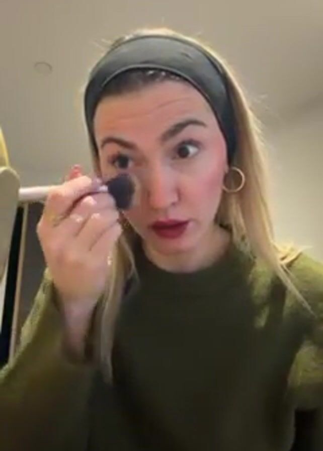 A woman is blending powder on her face with a makeup brush. She is wearing a dark green sweater, a black headband, and gold hoop earrings. She also has lipstick on. Her hair is blonde and pulled back. She is looking at herself in the mirror while blending her makeup. There is a door behind her.