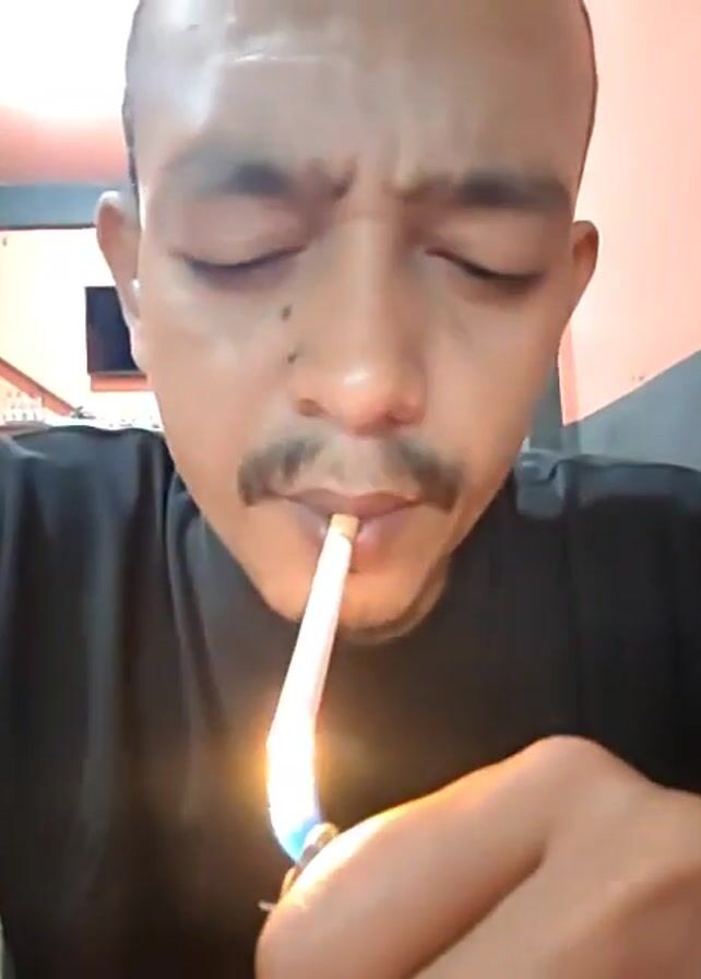 A medium close-up shot depicts a man lighting and smoking a cigarette