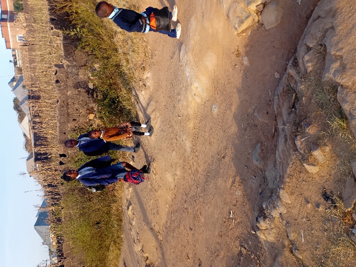 The image depicts an unpaved dirt road within a residential area of Jos, Nigeria, under clear, bright daylight. Four individuals, appearing to be school-aged children, are present. Three children are grouped on the left-center, walking towards the right side of the frame. The leftmost is a female, wearing a dark blue blazer over a white shirt and dark bottoms, carrying a red backpack on her left arm. Next to her, slightly behind, is a male in a similar dark blue blazer, white shirt, and dark trousers, carrying a dark backpack on his back. A younger female stands between them and slightly in front, wearing a brown patterned long-sleeved top and a matching skirt, with white socks and dark shoes. She faces slightly left. On the far right, a fourth child, a young male, walks towards the left, appearing to be alone. He wears a dark blue sweater with white trim, dark trousers, and white athletic shoes. He carries a dark, cylindrical container, possibly a lunchbox, in his right hand. The ground is uneven, comprised of dry, light brown soil with visible rocks, small ruts, and sparse dry grass. Along the left and extending behind the children is a strip of dense, dry vegetation, including tall, desiccated stalks, possibly corn, and green scrub. Behind this vegetation, a weathered concrete wall runs horizontally across the mid-ground. Beyond the wall, additional dry vegetation and several single-story residential buildings with various roof styles (some pyramidal, some gabled) are visible under a clear, pale blue sky. Shadows suggest the sun is low, either early morning or late afternoon.
