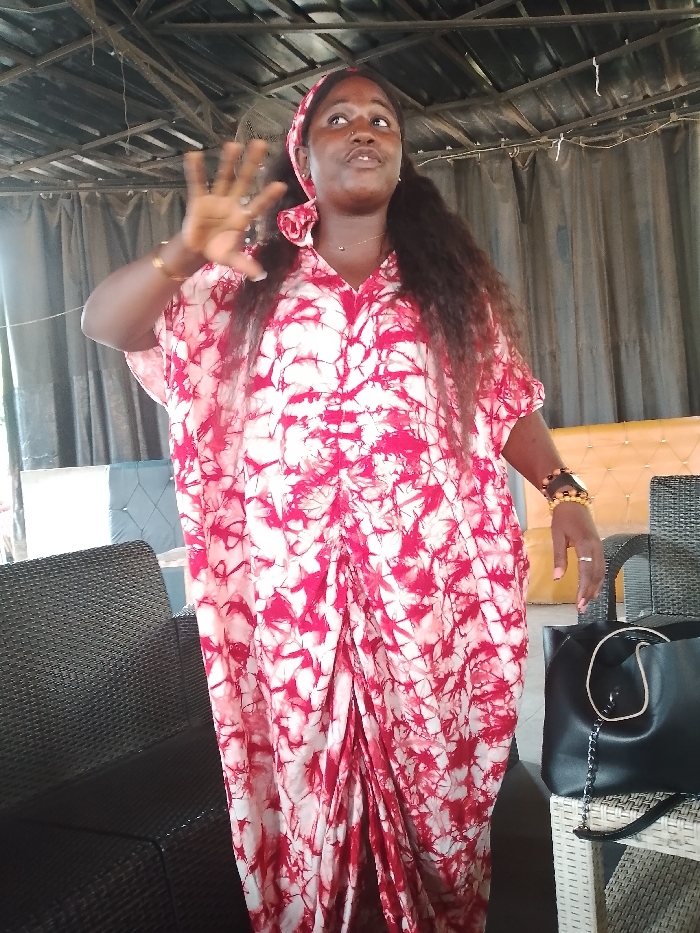 An adult female, appearing to be of African descent, stands within a semi-covered or indoor commercial establishment in Abuja, Nigeria. She has dark skin and long, dark, wavy hair, complemented by a red and white patterned headband. Her attire consists of a loose-fitting, V-neck kaftan-style dress featuring a red and white tie-dye or batik pattern. She wears a thin gold-colored necklace, a gold-colored bracelet on her left wrist, and multiple beaded bracelets on her right wrist, along with a gold-colored ring on her right ring finger. The woman is captured in a gesturing pose, with her left hand raised and fingers splayed, indicating active communication. Her mouth is slightly open, and her gaze is directed upwards and to her left, suggesting she is speaking. Her right hand is lowered by her side. The environment includes dark-colored, woven chairs to the left of the subject. To her right, a dark handbag with a chain strap rests on a light-colored surface. In the background, upholstered seating with light yellow/beige backrests and dark bases is visible. The overhead structure consists of exposed metal framing, possibly supporting a roof, and dark fabric panels or curtains are present in the deeper background.