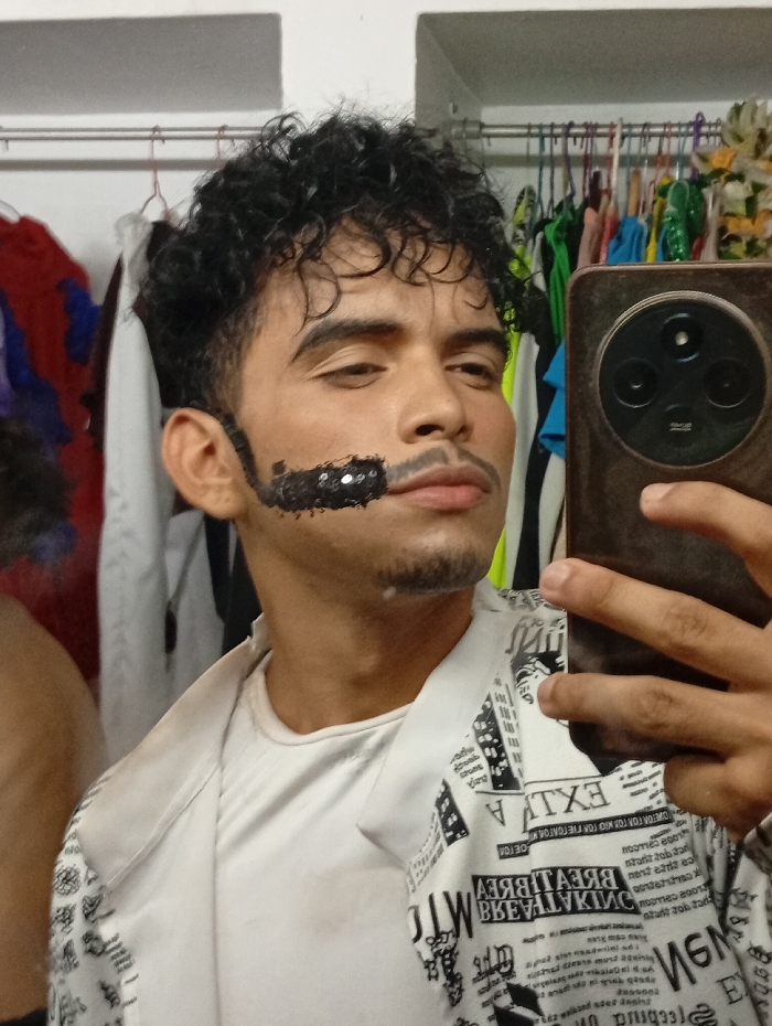 - "A person with curly dark hair and light brown skin takes a selfie with a cell phone, revealing wardrobe racks and hanging clothes in the background" by FM-xUvng2, licensed under CC BY 4.0
