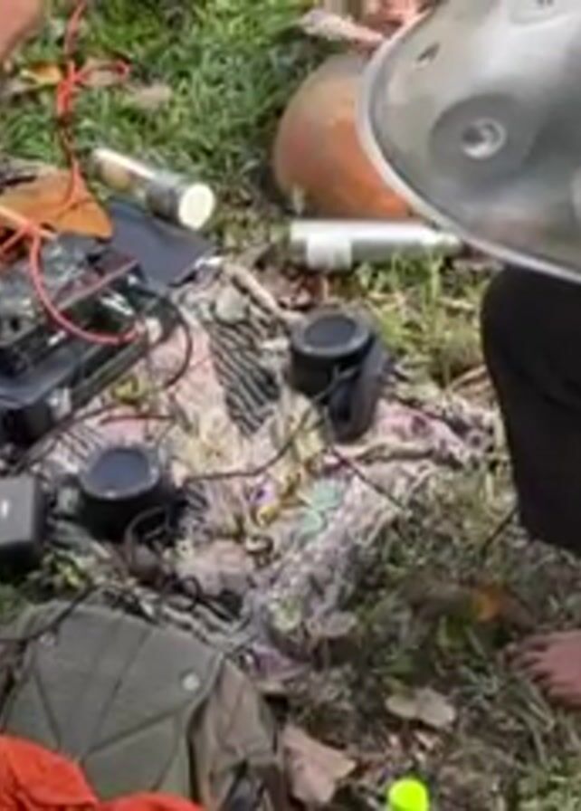 Three people sit on the ground in a small circle of grass, making music together. One person plays an electric guitar. Another plays a handpan. The third person is sitting near a wooden percussion instrument and microphone, but their hands are out of frame. The musicians are barefoot. The area around them is cluttered with wires, speakers, a mixing board, water bottles, and other items. A patterned blanket is spread on the ground. The lighting indicates it is daytime.