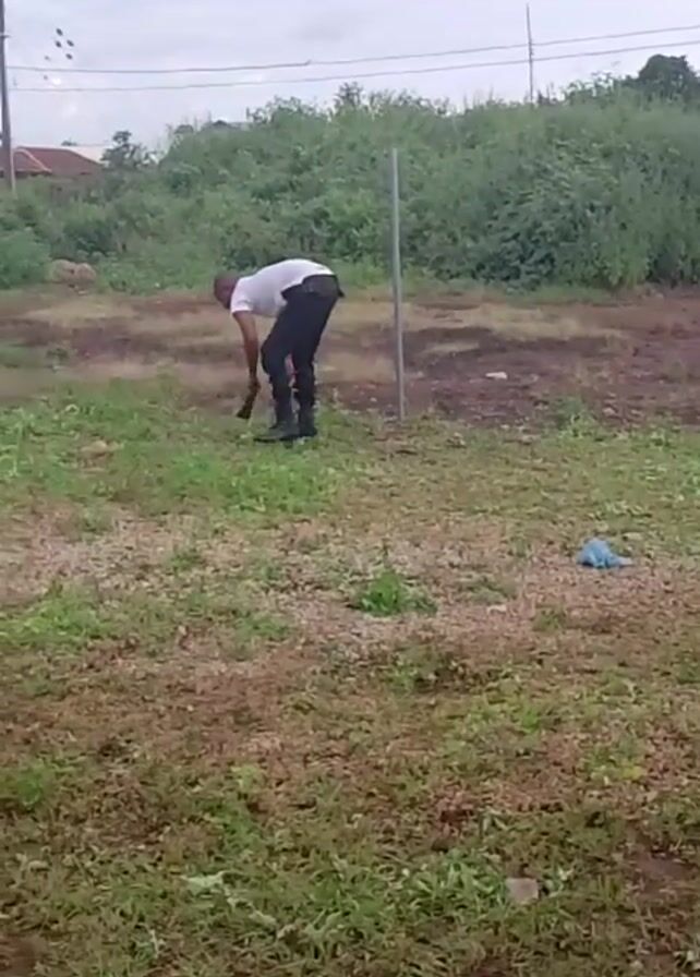two men clearing an area of grass and weeds. The area is partially enclosed by a fence of metal poles. The first man, wearing a white shirt and dark pants, is using a short-handled tool to cut the grass. He clears an area and walks away. The second man, wearing a tan shirt and dark pants, enters the frame carrying a tool and continues to clear the remaining weeds. The environment is a field with green grass and brown dirt patches, surrounded by a green treeline and houses in the distance. The sky is overcast.