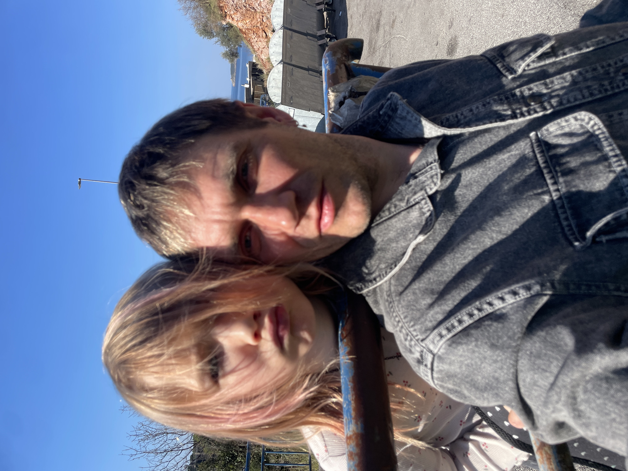 An outdoor, close-up, selfie-style photograph captures an adult male and a child in Podličak, Montenegro, under a clear blue sky. The adult male, positioned on the right and slightly forward, has short, light brown hair, visible stubble, and wears a dark grey denim jacket. A silver hoop earring is present in his left ear. His gaze is directed toward the viewer. Partially obscured behind and to the left of the male is a child with long blonde hair featuring pinkish streaks, styled with bangs. The child's face displays a pouting expression. She is wearing a light-colored, long-sleeved top with a faint floral pattern and a dark garment with white polka dots underneath. A rusted, blue and brown metal bar runs horizontally across the mid-ground, positioned between the two individuals and the background elements. To the left, sparse tree branches and green foliage are visible. The background on the right reveals four large, rectangular, grey metal dumpsters with wheels, arranged in a line on an asphalt surface. Behind the dumpsters, a rocky, reddish-brown hillside with some vegetation slopes towards a body of water, likely the Adriatic Sea or a bay. In the distance over the water, a white building, possibly a lighthouse or prominent structure, is visible on a landmass. A tall, slender streetlight pole stands against the sky in the upper mid-background. The scene is brightly lit by natural sunlight.