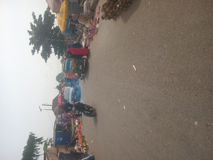 This image depicts a bustling street market scene in Kawo, Nigeria, under a bright, hazy sky