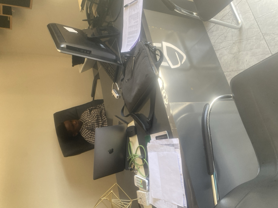 This image depicts an office interior in Jos, Nigeria, featuring a young male child seated behind a large desk