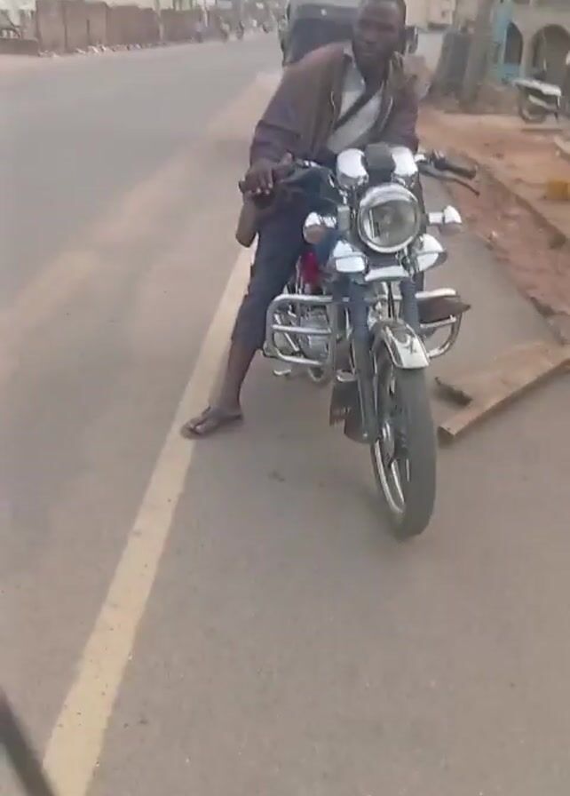 A man wearing dark clothing and flip flops sits astride a motorcycle with a sidecar on an asphalt road, seemingly stationary. The road has a yellow line marking a lane. There are buildings and other individuals visible in the background, suggesting an urban or semi-urban setting. The focus is on the man and his motorcycle.