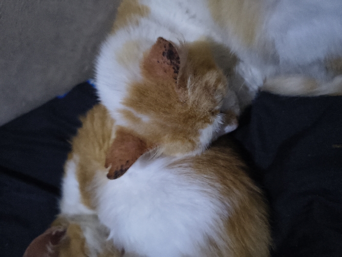 Two domestic cats are depicted resting on a dark fabric surface in An Khe Ward, Vietnam. The foreground cat is predominantly white with large ginger patches and is curled up with its head turned slightly away, eyes closed, indicating sleep or rest. Its visible left ear shows reddish-brown fur with scattered dark speckles. A second cat, similar in coloration (white with ginger patches), is partially visible in the background, also curled up and appearing to rest. No human subjects are present. The immediate environment includes a dark, possibly black, textile surface beneath the cats and an indistinct, lighter-toned background element, possibly a wall or furniture. The lighting is subdued.