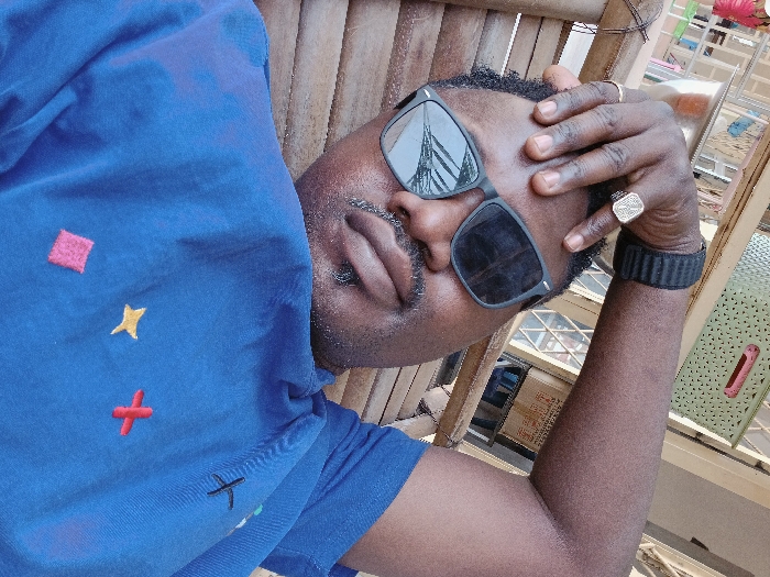 This image is a low-angle portrait of an adult male, likely of African descent, taken in Heany, Zimbabwe. The subject is wearing a blue short-sleeved collared shirt embroidered with a red square, a yellow star, a red plus sign, and a black cross on the left chest. He has dark, reflective sunglasses covering his eyes, short dark hair, a mustache, and chin stubble. A silver-colored signet ring is visible on his right ring finger, and a black textured wristband is on his left wrist. His right hand is resting on his forehead, with fingers slightly splayed. He appears to be seated or reclining against a light-colored, slatted wooden surface, possibly a chair or bench. The blurred background includes a light-green perforated plastic basket with a pink handle in the upper left, and indistinct architectural elements, possibly windows, along with faint outlines of cardboard boxes in the upper right. The scene is illuminated by bright, ambient light.