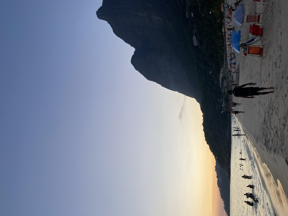 A coastal scene shows a beach with people enjoying the water and sand. On the right, beach umbrellas and chairs are visible. Along the shoreline, several individuals are wading in the water. A large, dark mountain dominates the left side of the image, sloping downward toward the beach. The sky transitions from blue to orange, possibly indicating sunset or sunrise.