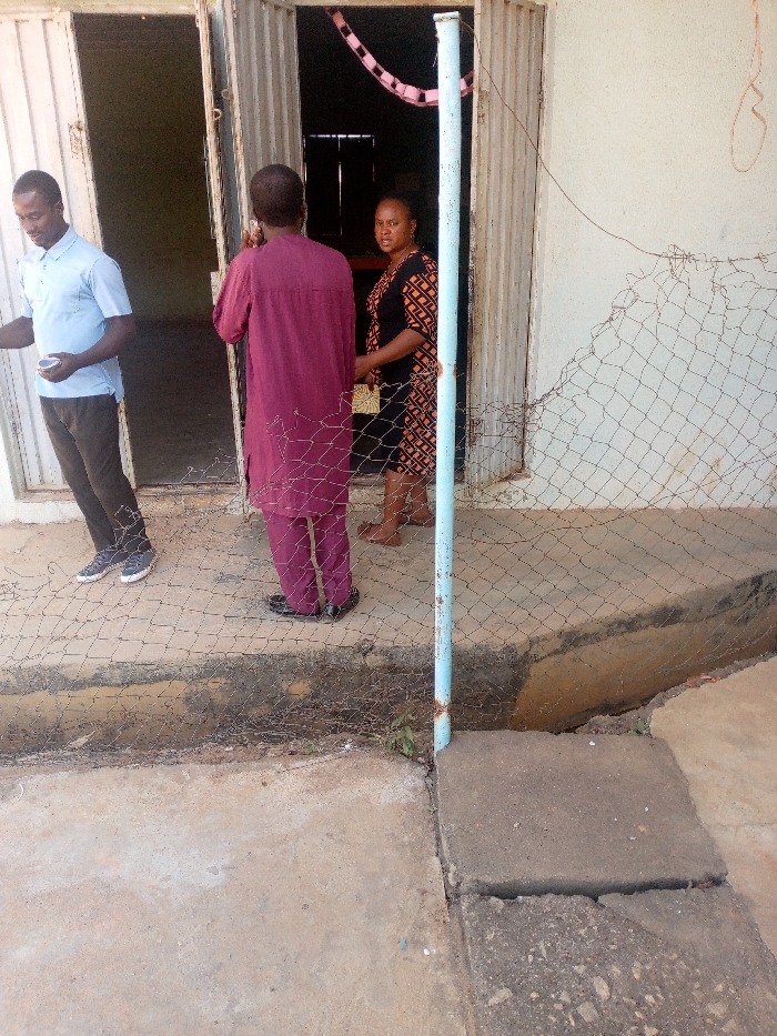The scene depicts three individuals positioned near the entrance of a building in Narayi, Nigeria, under daylight conditions. The building features a light-colored exterior wall and a wide doorway with two open corrugated metal folding doors. A pink, accordion-folded paper decoration hangs within the top of the doorway. On the left, a male individual stands facing slightly right, holding a white smartphone in his left hand. He wears a light blue short-sleeved collared shirt, dark trousers, and grey and white sneakers. In the center, a second male individual is observed from behind, facing into the building's interior. He wears a dark maroon long-sleeved tunic and matching trousers, with dark sandals. To the right, a female individual stands just inside the doorway, looking directly towards the camera. She wears a black dress with a light-colored geometric pattern and holds a small, light-colored object in her left hand. Her feet are bare or in very flat sandals. A chain-link fence, partially damaged and sagging, spans across the lower-mid foreground, separating the viewer's space from the area where the individuals are located. A light blue, possibly metal, pole stands vertically on the right side of the image, positioned in front of the building's wall and to the right of the female. The ground in the immediate foreground consists of cracked concrete. A narrow ditch or drainage channel runs beneath the chain-link fence, and a raised concrete step or platform leads up to the building entrance. Small patches of green vegetation are visible near the ground in the drainage area. The interior visible through the doorway appears dark and sparsely furnished.