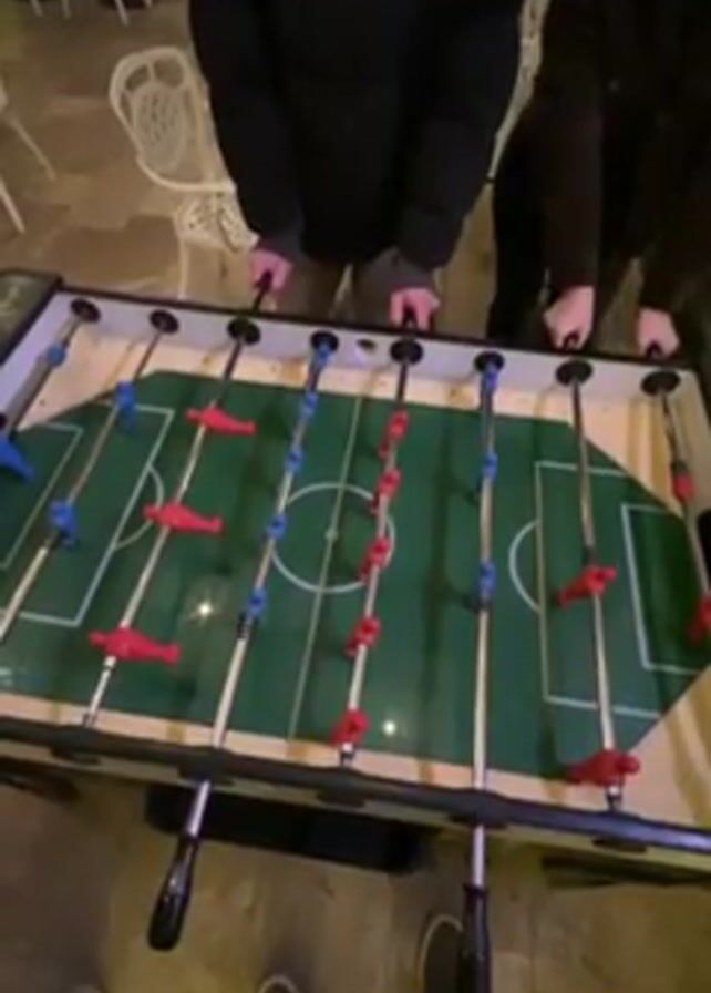 foosball game being played by two people outdoors. The table is rectangular with blue and red teams of foosball players on rods. Two people in dark jackets stand on either side of the table, each holding the handles of the rods and moving them to control the players. The camera is held by a third person, focusing on the table from their perspective. The background includes white chairs and a tiled floor.