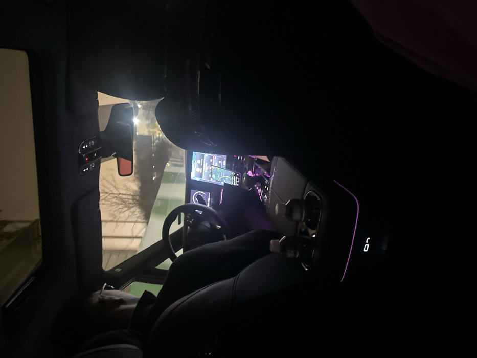 Inside a car at night, the driver sits behind the wheel with hands on the steering wheel