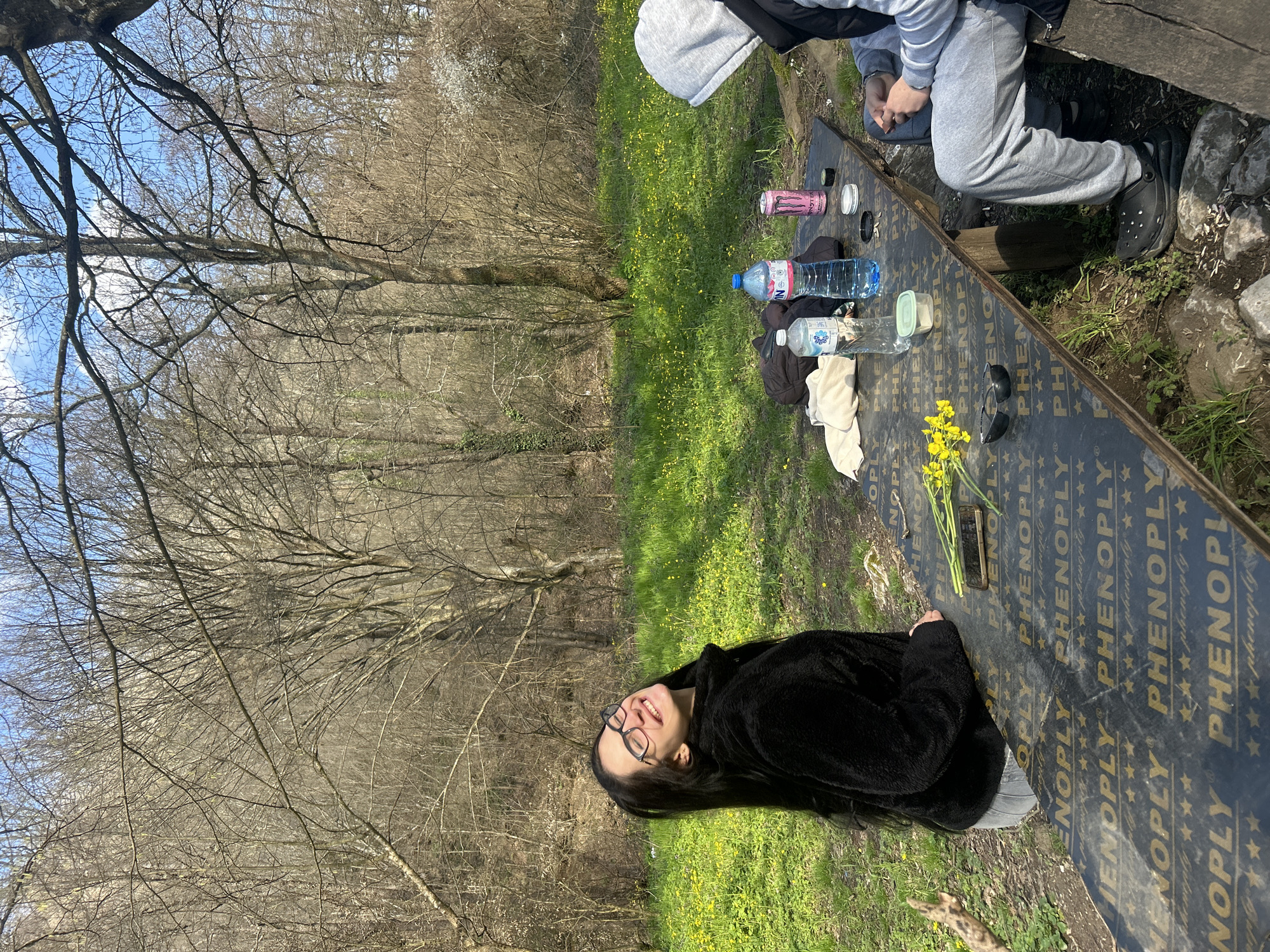 The image depicts a group of people outdoors in a natural setting near Mladezhko, Bulgaria. A woman with long dark hair and glasses lies on a table marked with "PHENOPLY" branding. On the table are various items including water bottles, a can of Monster Energy drink, sunglasses, a phone, and a small bunch of yellow flowers. Another person, wearing a grey hoodie and grey sweatpants, is sitting at the edge of the table. The background consists of a grassy field with yellow wildflowers and a forest of bare trees under a blue sky.