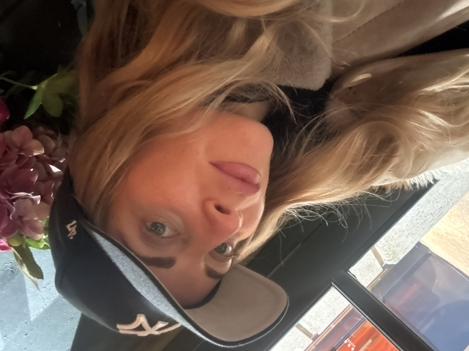 A blonde woman with fair skin wears a dark baseball cap with a white "NY" logo
