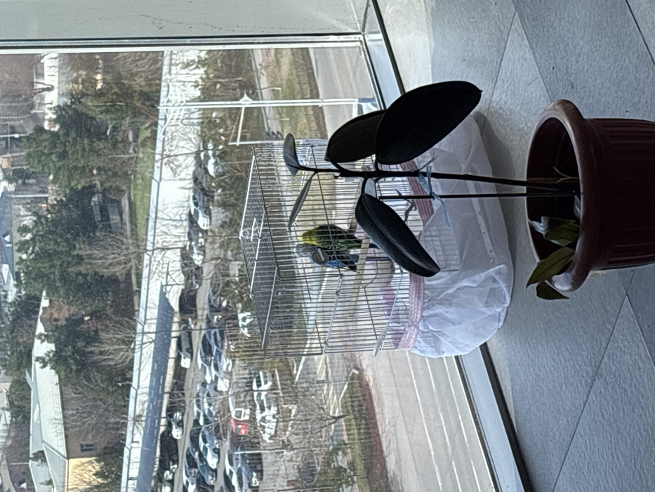 A birdcage, seemingly by a window, contains a green and blue parakeet. A potted plant with large, dark leaves sits adjacent to the cage, slightly obscuring the view of the bird. Outside the window is a scene of buildings, trees, and a parking lot full of cars. The background is somewhat blurred, indicating a focus on the bird and the immediate indoor environment.