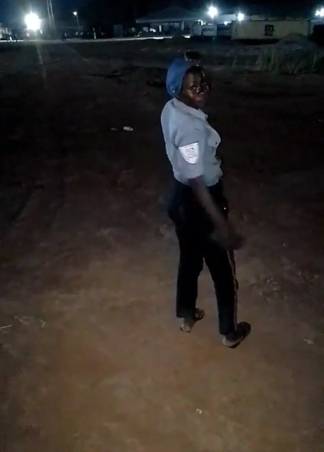 The video depicts a person standing outdoors at night. The individual is wearing a light-colored shirt, dark pants with a red stripe down the side, and a blue head covering. They appear to be on a dirt or gravel surface. In the background, there are lights and the silhouettes of buildings or structures. The camera moves and zooms slightly during the video. The lighting is dim, and the video is grainy. A phone model watermark appears in the lower left corner.