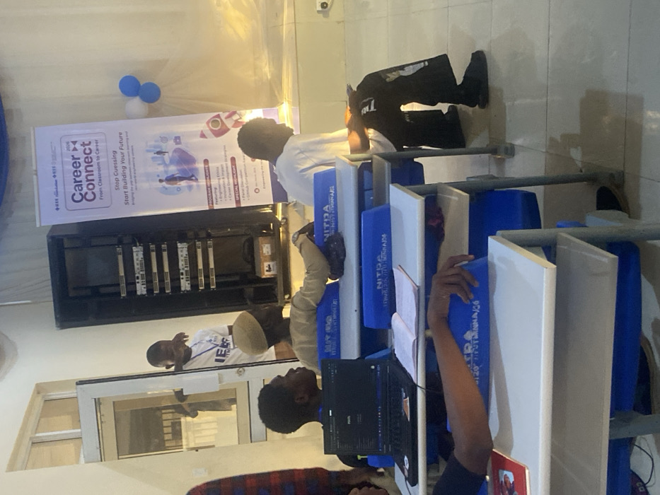 The scene depicts an indoor gathering in Baganakwo, Nigeria, featuring multiple individuals seated in an educational or workshop setting. In the immediate foreground, a dark-skinned arm rests on a white desktop of a blue and white integrated student desk/chair unit, marked with "NITDA MINNA/06." A black laptop is open on this desk, displaying a screen with dark background and light text, positioned next to an open notebook. Further back, three young Black males are seated in similar blue and white desk/chair units. From left to right: 1. A male with short dark hair, facing right. 2. A male wearing a light tan traditional cap and a light-colored long-sleeved garment, with his right arm resting on the backrest of his chair, looking right. This chair is marked "NITDA AJOA." 3. A male in a white t-shirt and dark pants, seated, facing slightly left and looking downwards. He has his left arm bent, holding an unseen object. In the left background, near an open white-framed glass door, a young Black male wearing a white t-shirt with "IES" printed on it stands partially obscured, looking towards the scene. A faint reflection of another individual is visible in the glass door. To the right of the standing individual, a tall black server rack with multiple horizontal components is visible. Adjacent to the server rack is a prominent white vertical banner titled "Career Connect 2026," with text including "From Classroom to Career" and "Stop Guessing Start Building Your Future." The banner lists "PROGRAM HIGHLIGHTS" such as "Engineering Ethics," "Innovation & Impact," and "Career Development," along with "SPECIAL HIGHLIGHT" items like "Panel Discussion" and "Github Competition." Graphics on the banner include human figures, a building, a thought bubble, and a rocket. Two blue balloons and one white balloon are affixed to the wall to the right of the banner. The floor is light-colored tile, reflecting ambient light. The overall lighting is bright, creating significant highlights, particularly around the banner area.