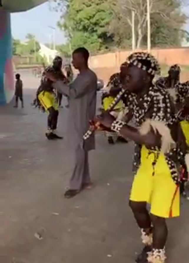 group of people performing a traditional dance underneath a bridge. The dancers are mostly young men, wearing yellow shorts, black tops decorated with cowrie shells, and matching headwear and ankle decorations. They are playing drums and other percussion instruments. A man in a gray suit appears to be observing or directing the performance. The environment is an urban area with a painted bridge overhead and buildings and foliage in the background. There are other people in the background, some watching the performance, some wearing reflective vests, and a few vehicles are visible.
