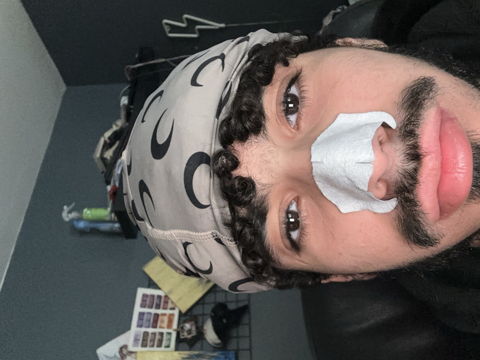 A frontal close-up photograph captures a male subject indoors in Marcoussis, France. The individual, identified as a young adult male, has dark curly hair partially visible beneath a light grey durag adorned with a repeating pattern of black crescent moons. He possesses brown eyes, a mustache, and a short beard. A white nasal strip is applied across the bridge and sides of his nose. The subject maintains a direct gaze towards the viewer. The background consists of a solid dark teal wall. To the left, a wire grid is visible, displaying various attached papers and possibly small cards, along with a white object. Above this grid, a black shelf holds several items, including a green spray bottle and a clear bottle. To the right of the subject's head, a white neon lightning bolt decorative sign is illuminated.