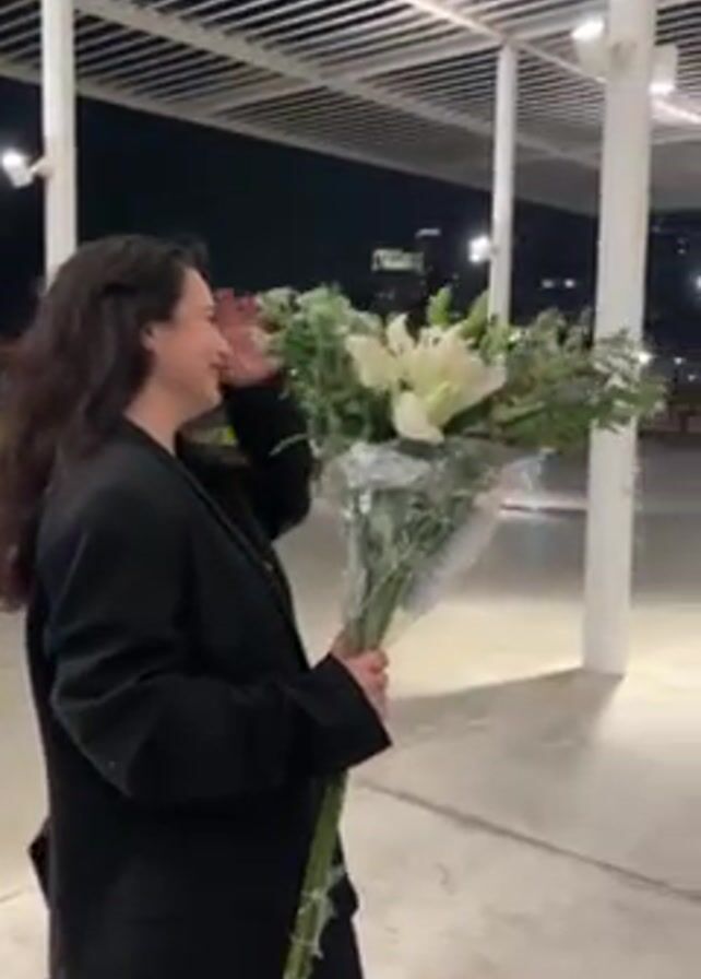 group of young women at an outdoor urban setting at night. The first woman is wearing a black blazer and holding a bouquet of white lilies and greenery. She is smiling. The camera then pans to another woman holding a camera, and then to other women, some of whom are smiling and talking. The environment includes a covered walkway with white beams, a city skyline in the background, and lights. The mood is lighthearted and celebratory.