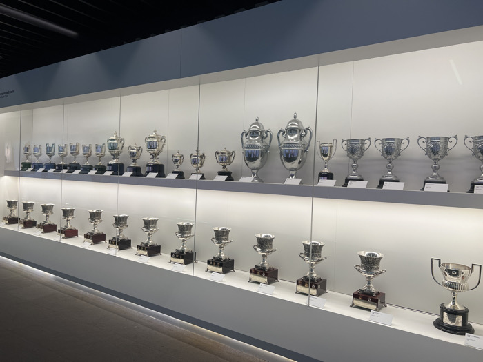 - "The image displays a brightly illuminated museum exhibition showcasing numerous polished silver-colored football trophies inside a glass display case" by FM-F4K0A2, licensed under CC BY 4.0