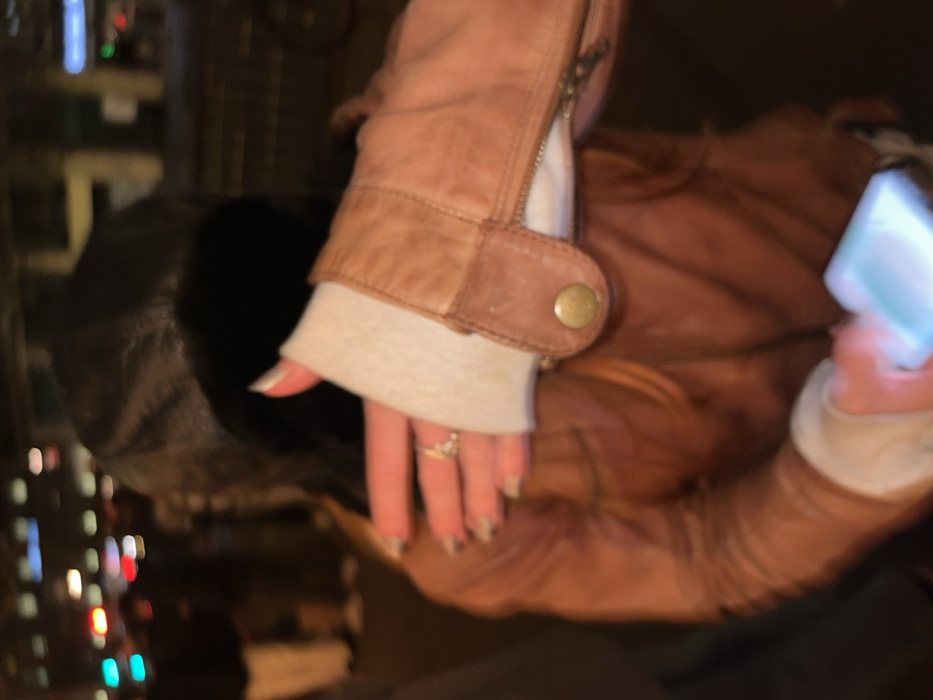 A person in a brown leather jacket and a black hood is holding a phone, possibly taking a photo. The jacket sleeve has a button closure over a gray sweater cuff. The person's hand, adorned with a ring, is visible. In the background, there is a blurry view of city lights.