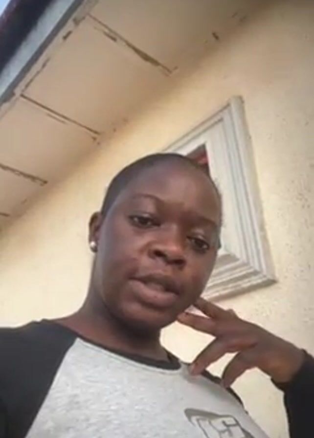 A video shows a woman standing outdoors. She is wearing a gray and black shirt. The background consists of a beige wall, a window with a white frame, and a white roof overhang. The woman speaks to the camera, gesturing with her hands. She touches her face at one point. The video seems to be taken at a low angle, looking up at the woman.