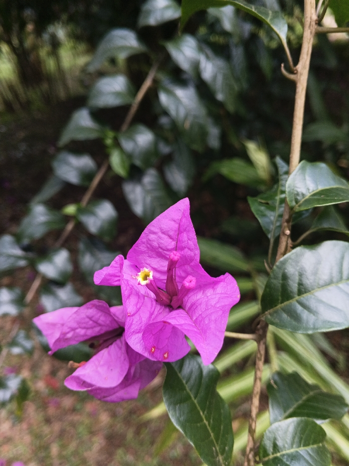 A vibrant magenta bougainvillea flower dominates the image. Its papery bracts are arranged in a cluster, revealing a tiny yellow center. The flower is set against a backdrop of lush green foliage and woody stems. Leaves varying in shape and size fill the frame, creating a natural, slightly blurred environment. The scene is likely captured outdoors.