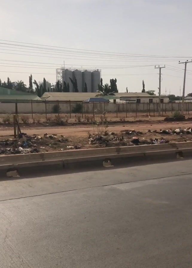 drive down a road from the perspective of a person in a yellow motorized tricycle. The area to the right of the road has some trash on the ground in front of a wire fence. There are some large cylindrical tanks in the distance. As the tricycle continues driving, the perspective shifts to a view from inside the vehicle, capturing the driver in the side mirror. The tricycle passes a yellow dump truck on a dirt road.