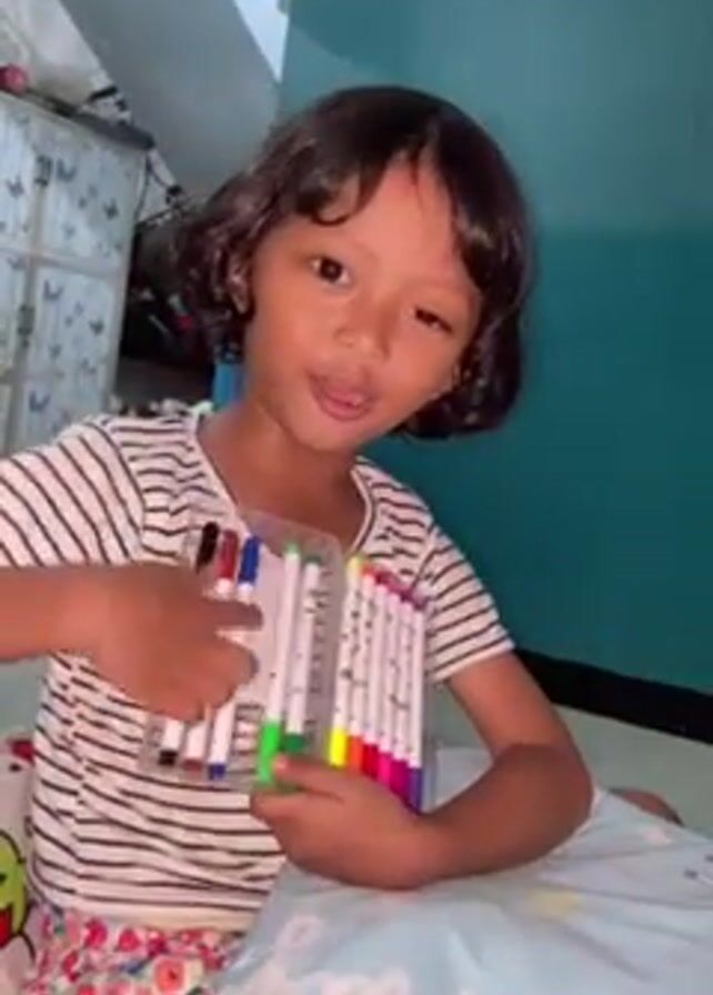 A young girl is seen in a close-up, sitting on what appears to be a bed or floor. She wears a striped white and black shirt and floral patterned pants. She holds two clear plastic cases filled with colorful markers, presenting them to the camera. Her hair is dark and curly. The background includes a blue wall, a white cabinet, and a partially visible light blue pillow. The girl speaks, turns slightly to show the markers, and seems to be demonstrating how they can be put together.