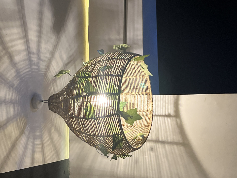 A woven, pear-shaped light fixture hangs against a wall. Green leaves are interspersed throughout the weaving. The light shines brightly, casting a patterned shadow of lines radiating from the light fixture onto the wall to the left. A vertical strip of pale yellow is visible behind the fixture, and a dark blue panel is next to it. A section of a cream wall is on the right side.