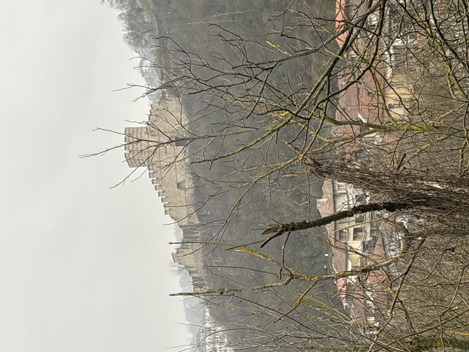 The image displays a panoramic view of Tsarevets Fortress in Veliko Tarnovo, Bulgaria, under an overcast sky. In the foreground, numerous bare tree branches, some covered with yellowish-green lichen, partially obscure the lower and mid-ground. The mid-ground reveals a cluster of residential buildings with reddish-brown tiled roofs and light-colored facades, nestled on a hillside among sparse, deciduous trees. In the background, atop a steep, wooded hill, stands the formidable Tsarevets Fortress. Its light-beige stone defensive wall, featuring crenellated battlements, stretches horizontally across the ridge. A prominent, square-shaped stone tower, consistent with Baldwin's Tower, is visible on the right side of the wall. The overall scene is devoid of discernible human activity, presenting a still landscape on a muted, possibly winter or early spring, day.