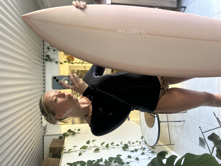 A woman in a black long-sleeved top and patterned bottoms holds a light pink surfboard in front of her face, taking a selfie in a mirror