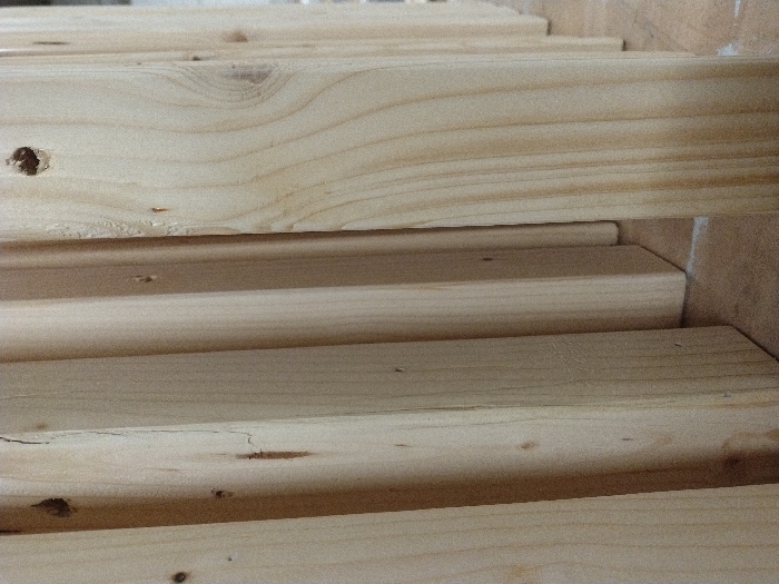 This scene is located in Leudelange, Luxembourg. The image displays a close-up, vertical arrangement of numerous light-colored wooden planks or beams. The wood exhibits distinct natural grain patterns, varying shades of beige and light brown, and scattered dark knots. Several planks present minor longitudinal cracks and surface imperfections. The planks are oriented upright, standing on a flat, light-colored surface. The perspective emphasizes the parallel arrangement and texture of the wooden elements. No individuals or dynamic actions are visible within the frame. The environment appears consistent with an indoor setting, such as a lumberyard, workshop, or storage facility.